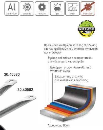 – Αντικολλητική κεραμική επίστρωση ‘Marble’, ιδιαίτερα ανθεκτική σε υψηλές θερμοκρασίες (μέχρι 260°C). Τριπλή επίστρωση καθιστά τα σκεύη ανθεκτικά στη φθορά.