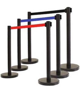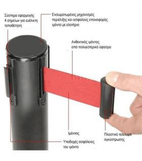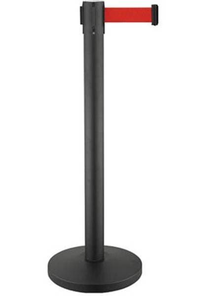 Κολωνάκι οριοθέτησης μαύρου χρώματος με κόκκινο ιμάντα μήκους 2 μέτρων συνολικού ύψους 91 εκατοστών. Είναι κατάλληλο για οριοθέτηση χώρων και κατεύθυνση κοινού σε χώρους μαζικής συνάθροισης. Διαθέτει βαριά βάση, μηχανισμό περιέλιξης και επαναφοράς του ιμάντα.